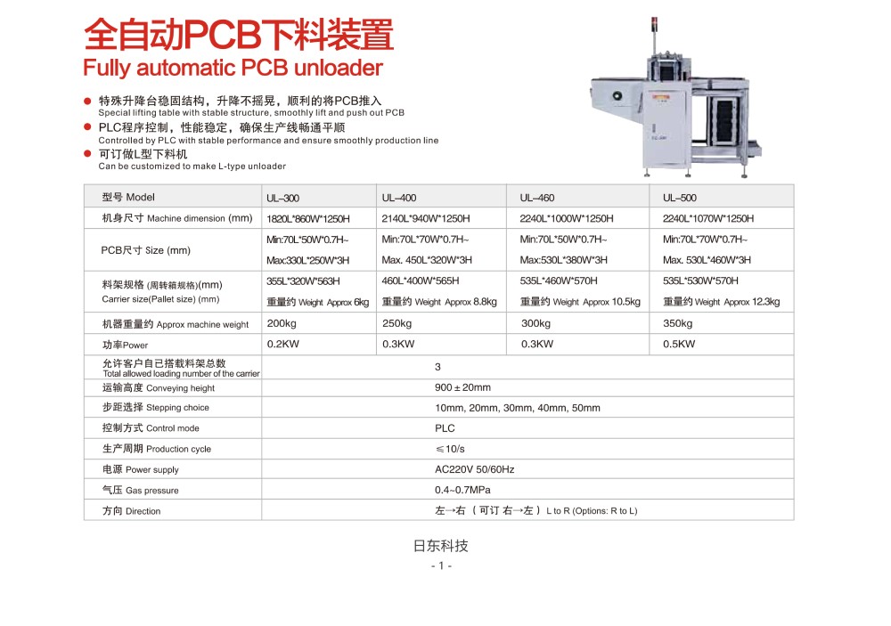 全自動PCB下料機介紹:特殊升降臺穩(wěn)固結(jié)構(gòu),升降不搖晃,順利的獎PCB推入。PLC程序控制,性能穩(wěn)定,確保生產(chǎn)線暢通平順。可訂做L型下料機。