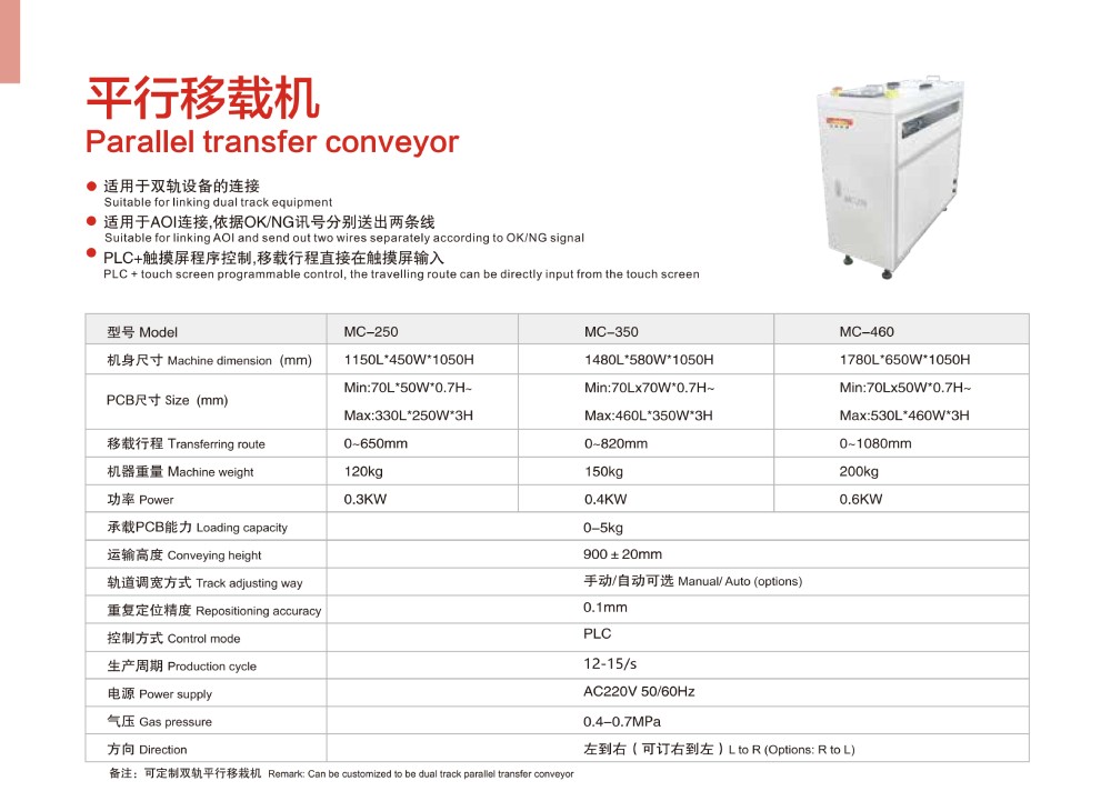 smt平行移載機介紹:適用于雙軌設備的連接;適用于AOI連接,依據OK/NG訊號分別送出兩條線;PLC+觸摸屏程序控制,移載行程直接在觸摸屏輸入。