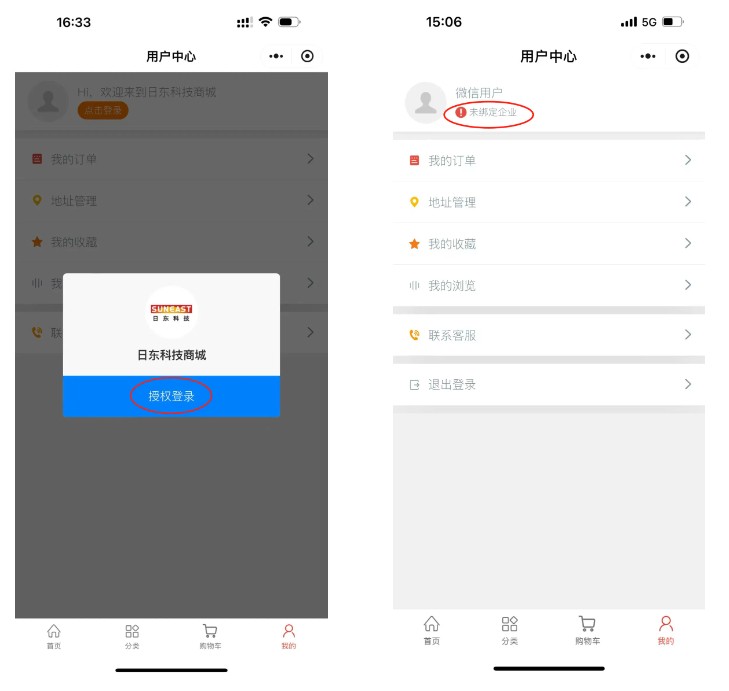 進(jìn)入首頁(yè)需先點(diǎn)擊-我的-點(diǎn)擊登錄-授權(quán)登錄 –綁定企業(yè),完善企業(yè)資料。詳細(xì)操作如下圖所示: