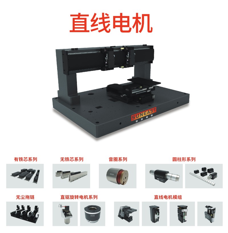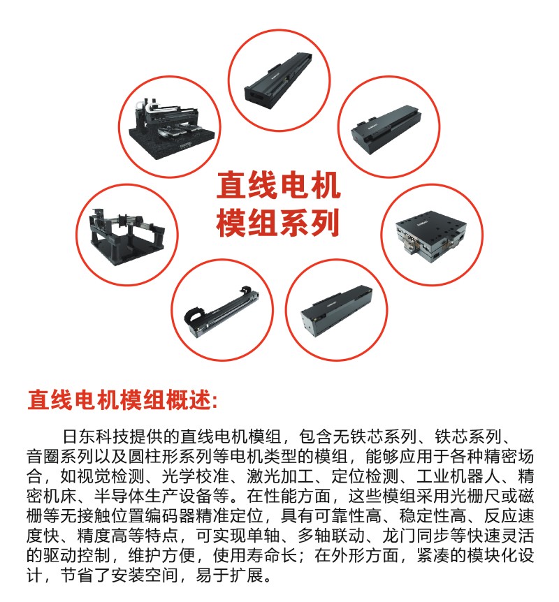 日東科技自主研發(fā)的直線電機產(chǎn)品系列,集高精度(100納米重復定位精度)、高響應速度、高穩(wěn)定性及可靠性等優(yōu)點,廣泛應用于各行業(yè)精密場合,如視覺檢測、光學校準對位、激光加工、工業(yè)機器人、精密機床等。產(chǎn)品采用光柵尺或磁柵等無接觸位置編碼器精準定位,可實現(xiàn)單軸、多軸聯(lián)動,龍門同步等快速靈活的驅(qū)動控制,維護方便,使用壽命長,同時緊湊的模塊化設計節(jié)省了安裝空間,易于擴展。