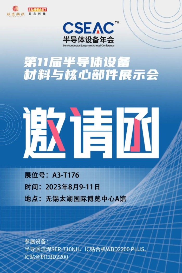 日東科技受邀參加本屆展會,將展出半導體專用回流焊、半導體封裝設備“IC貼合機”,并在8月10日上午的專題活動:新品發布專場,進行IC貼合機的新產品發布,歡迎您蒞臨日東展臺和新品發布會場,與我們面對面溝通交流!