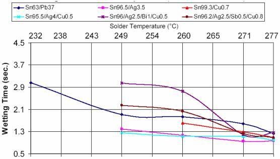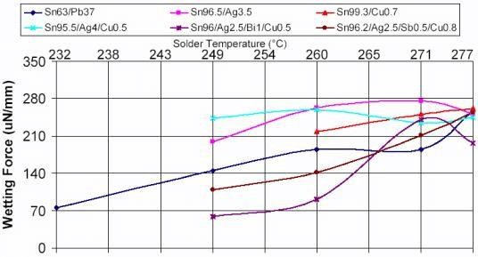 波峰焊的溫度并不等于錫爐溫度,在線測試表面,一般焊接溫度要比錫爐溫度低5℃左右,也就是250℃測量的潤濕性能參數(shù)大致對應(yīng)于255℃的錫爐溫度。通過實(shí)驗(yàn)表明,一般的無鉛釬料合金,最適當(dāng)?shù)腻a爐溫度為271℃。此時常用的無鉛合金一般存在最小的潤濕時間和最大的潤濕力,如圖5-27所示。當(dāng)采用不同的助焊劑時,無鉛釬料潤濕性能最佳錫爐溫度有所不同,但是差別不大。